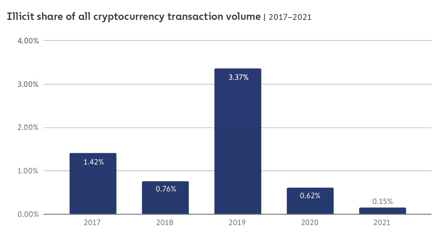 If you think 10.5% (~$700M+) is a lot, it isn’t. Chainalysis research shows that a minuscule 0.15% of total cryptocurrency volumes in the whole of 2021 (a boom market nonetheless) were tagged to “illicit” transactions. That’s how little crypto is used in criminal activity.