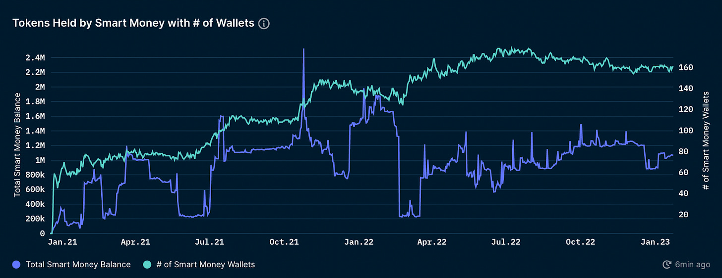 The price of FXS has soared to start 2023, soaring 143.1% and 74.3% against USD and ETH respectively YTD. Along with a rally in the border crypto market, this outperformance is likely driven by the growth of Frax Ether and the rally in all LSD governance tokens in anticipation of the Shanghai upgrade, which will enable withdrawals from staking. Perhaps as an encouraging sign for FXS bulls, this move has been driven in part by smart money holders, whose balances of the token have increased 20.9% YTD.