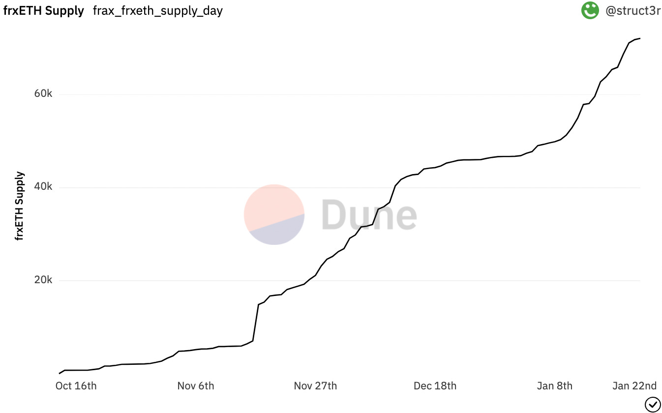 Frax Ether has grown considerably since its October 2022 launch, with the protocol attracting 72,091 in ETH deposits. This makes frxETH the fifth-largest LSD behind Lido, Coinbase, Rocket Pool, and StakeWise. Notably, the protocol has been growing the fastest of any LSD over the past 30 days, increasing its supply by 57.7% during this period.