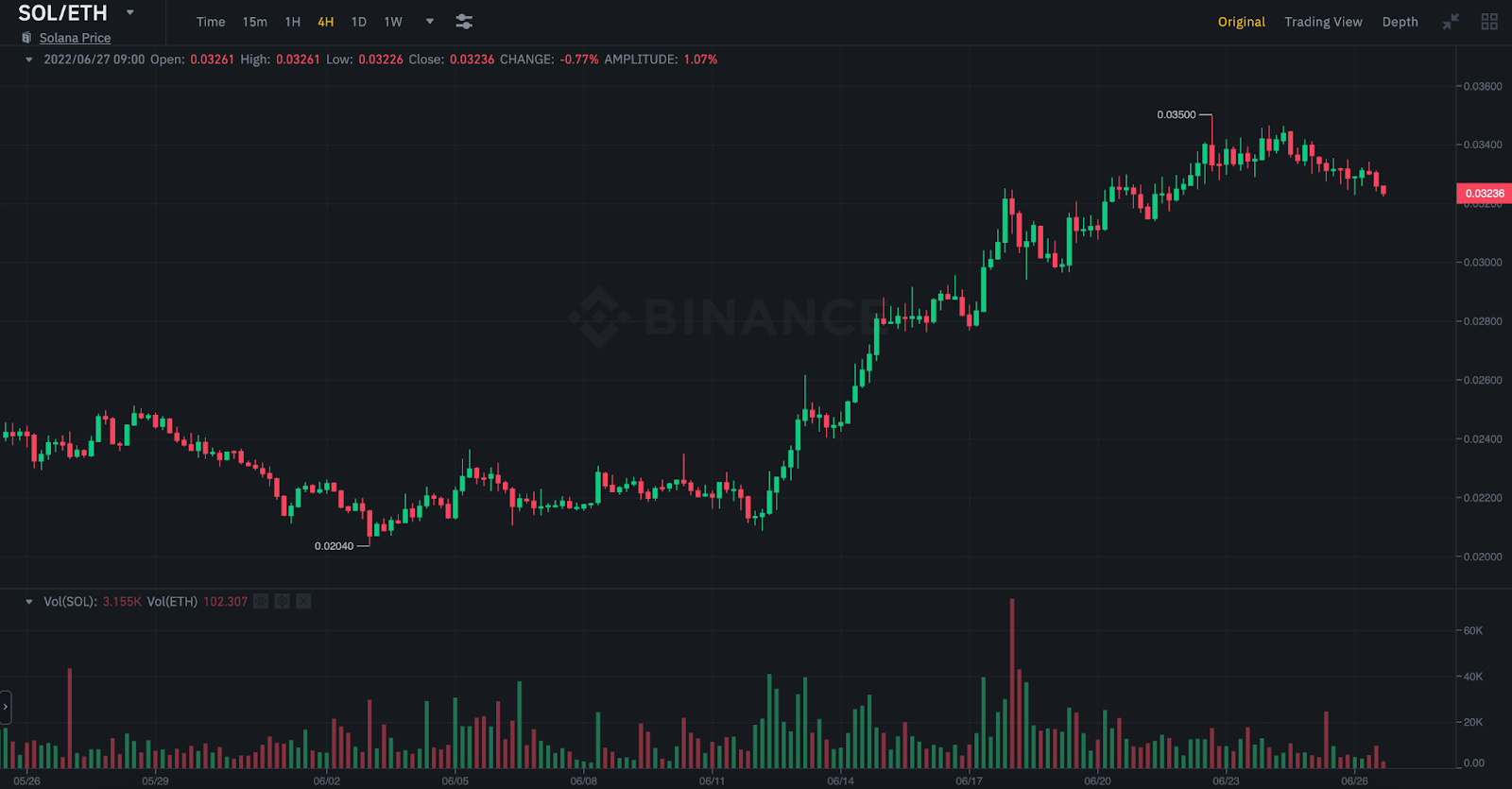 SOL is the native token of the Solana blockchain. SOL has outperformed since June 12, rallying 37.9% from $27.87 to $38.44, while the crypto market has fallen 12.6% during this period. The token has also shown considerable strength against the majors up 71.2% and 55.2% against BTC and ETH respectively over the past fifteen days.