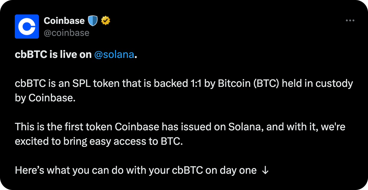 Brian Armstrong, Coinbase’s founder, has been a prominent backer of the Fairshake PAC, and this post-election surge demonstrates the market’s confidence in both Coinbase’s leadership and how they stand to benefit from new, pro-crypto policies. In parallel, Coinbase expanded support for cbBTC — their 1:1 pegged Bitcoin derivative — to Solana, with integrations with Jupiter, Kamino Finance, and other core DeFi platforms coming right off the bat.