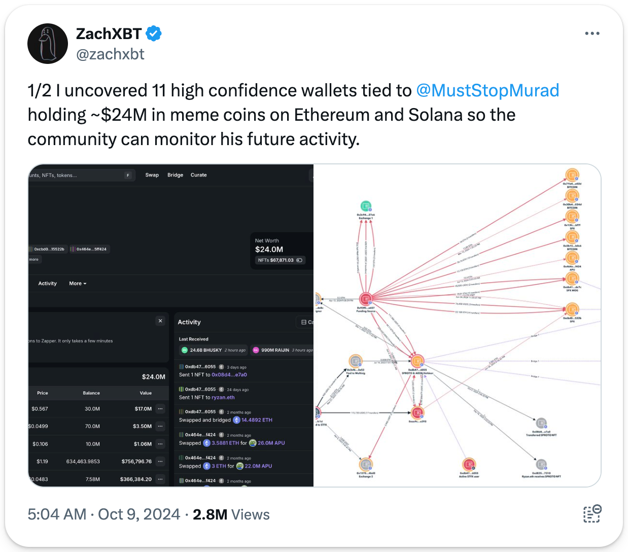 Memecoin drama reached a fever pitch as ZachXBT published memecoin investor Murad Mahmudov's 11 secret wallets. ZachXBT argued this transparency was essential to prevent Mahmudov from dumping on his followers, while critics said it exposed him to unnecessary risk.