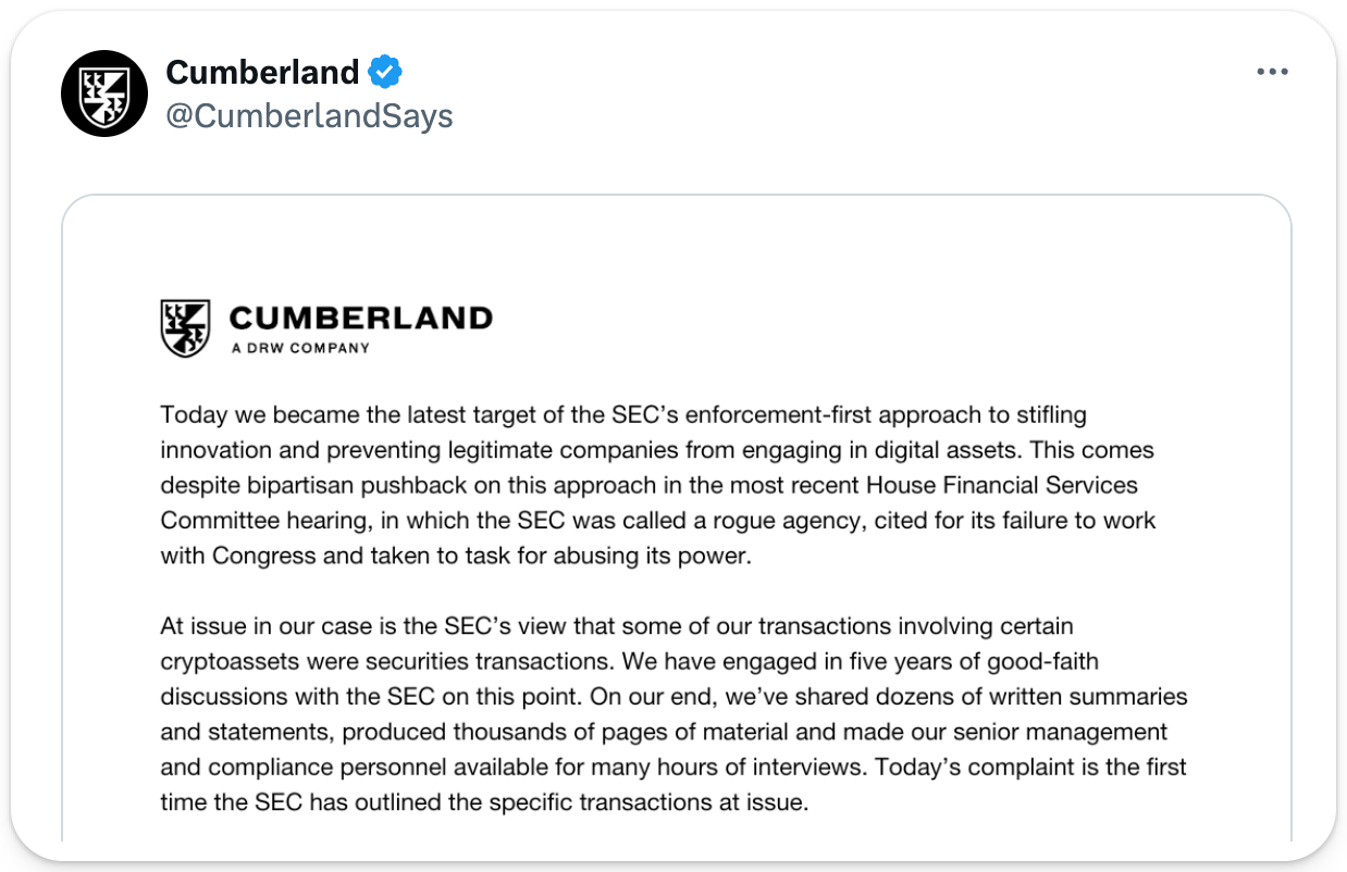 In related news, market marker Cumberland DRW was sued by the SEC for operating as an unregistered dealer. Cumberland responded by stating that it's been in continuous communication with the SEC over the past five years, and it acquired a registered broker-dealer in 2019 to meet its requirements. They believe they are in the right and will not change their business, despite the suit, as a result.