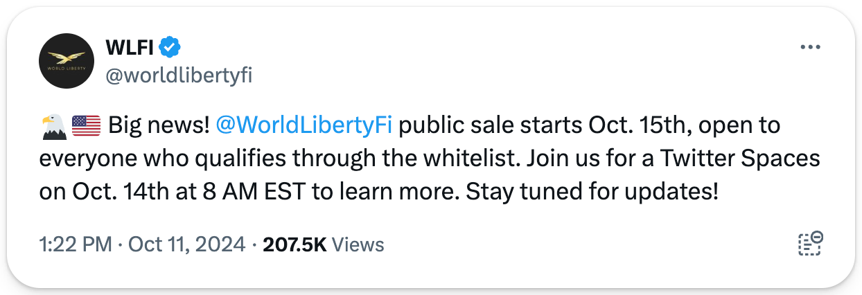 Donald Trump-linked DeFi project World Liberty Financial (WLFI) announced its public sale will kick off Tuesday, aiming to raise $300M at a $1.5B valuation.