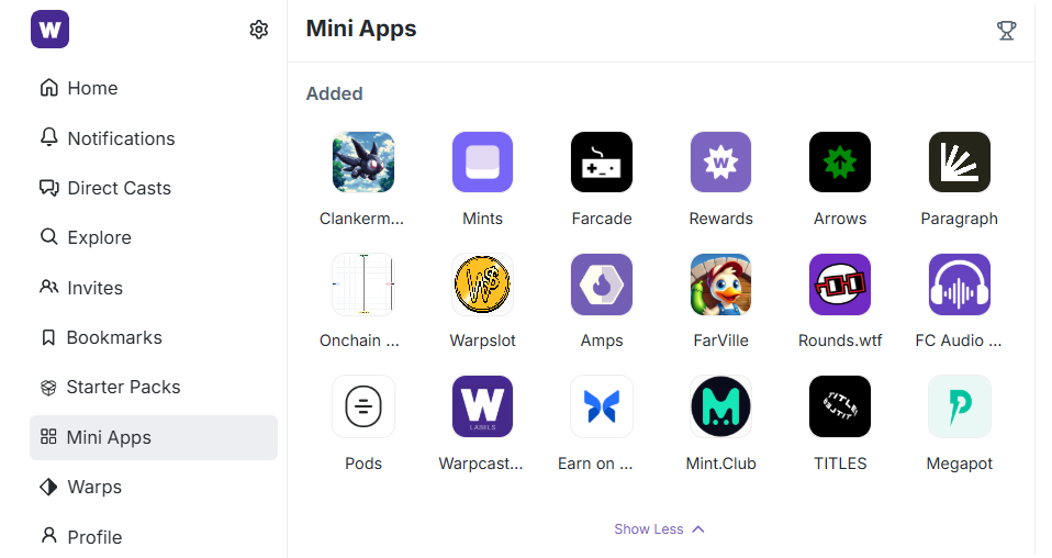 If you want to dive into Mini Apps, you can head to warpcast.com/~/mini-apps, as Warpcast is the flagship Farcaster client and the best way to interact with these apps today.