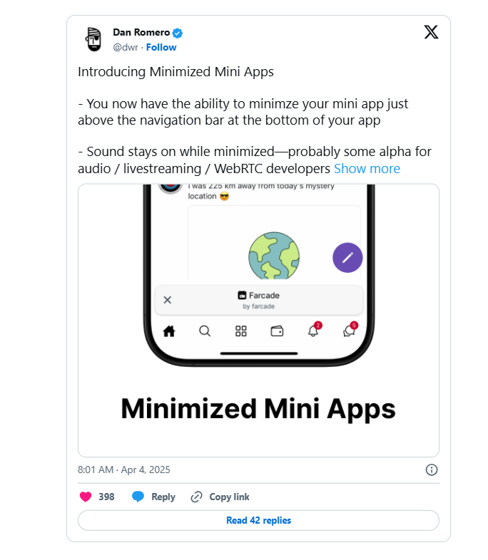 Better yet, Farcaster just rolled out support for minimized Mini Apps, so now you can keep scrolling your feed while still engaging with your app of choice in the foreground.