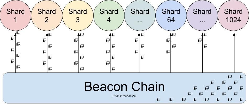 Having 300,000 validators (300k instances of 32 ETH staked) all securing one monolithic chain is an overabundance of security, and is an inefficient allocation of resources. By spreading out validators across multiple chains, Ethereum’s L1 can scale by creating 64 Ethereum’s by having ~4,500 validators on each one.