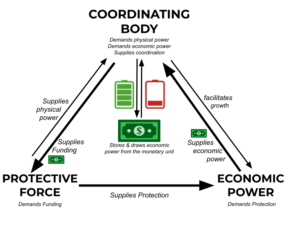 When these three parts of an economic system are composed together, they create a ‘Nation-State’, a composed integrated body of productive internal organs (the economy), a central nervous system for coordination and long-term planning (the government), and teeth, claws, and weapons for protection (the protective force)