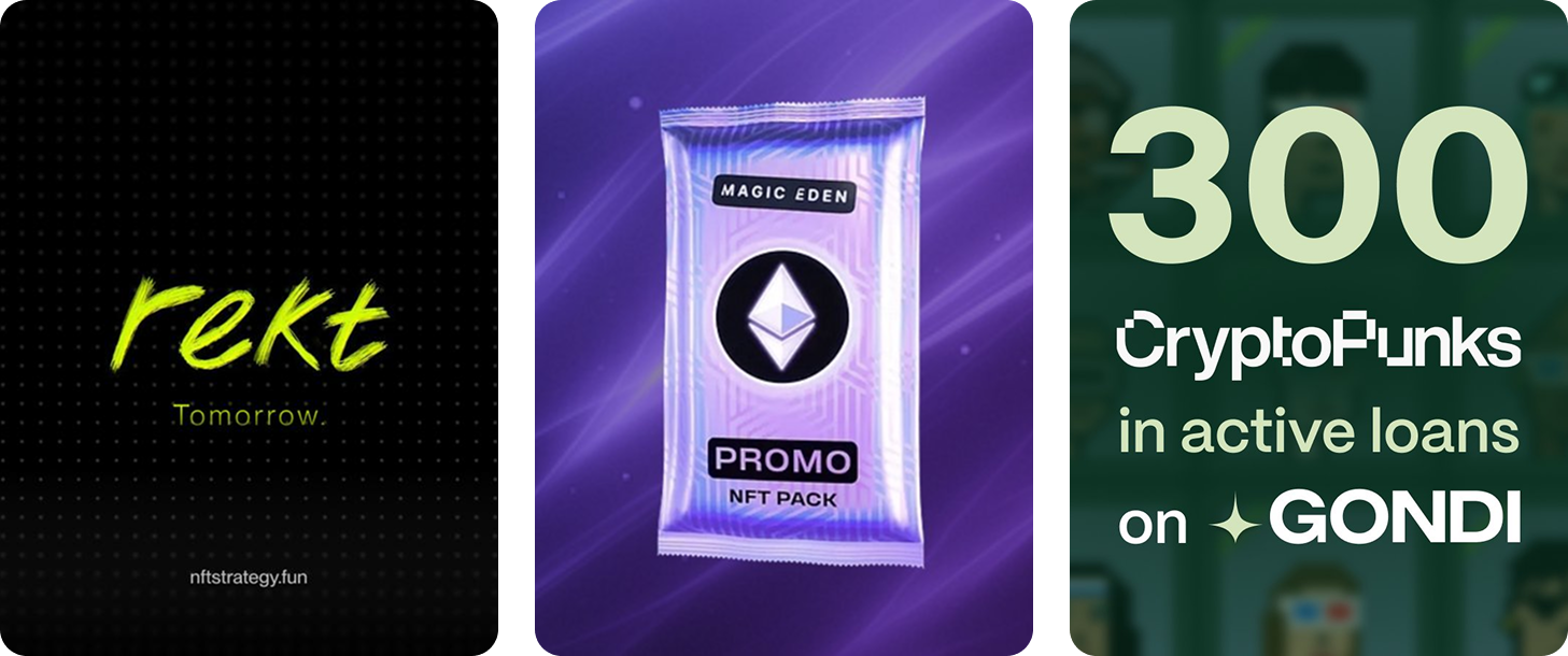 - 📈 GONDI's New Record. The NFT lending platform announced today that its protocol had reached 300 CryptoPunks in active loans, a new all-time high for the project. Loan sizes are ramping up here, too, as someone just borrowed 1M USDC against 11 'Punks.
