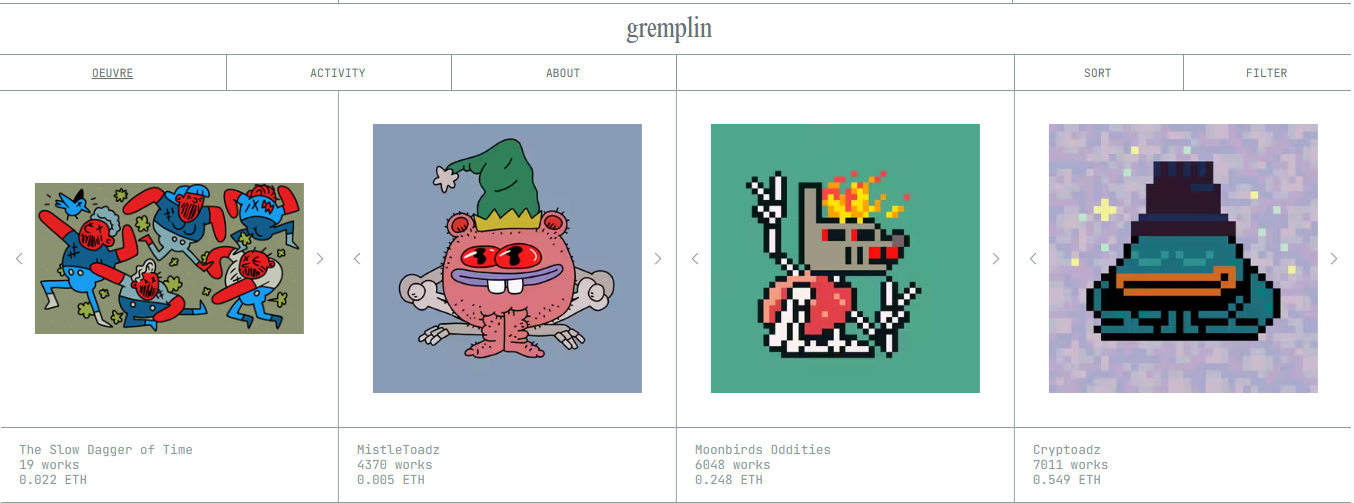For example, one of my favorite artists is Gremplin. When I go to his Raster profile, the page surfaces +40 collections—it's easy to look through and discover pieces that are hard to find elsewhere:
