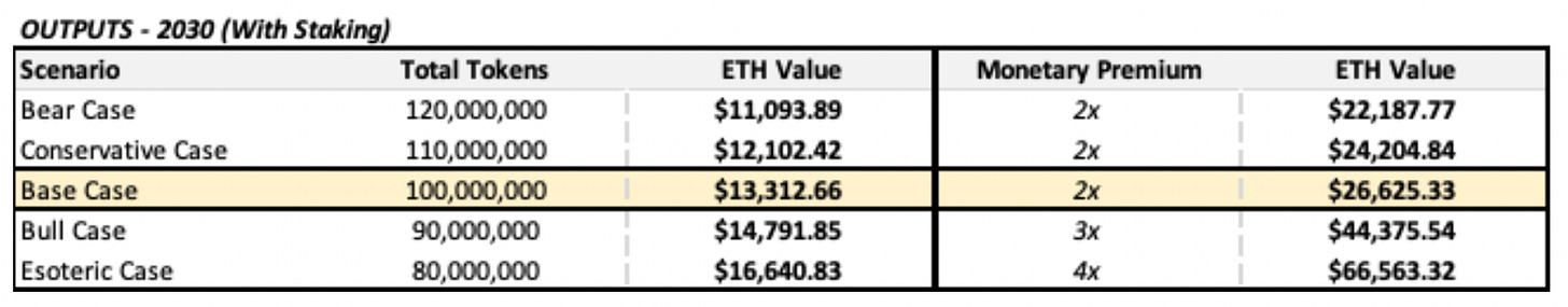 When we factor in a monetary premium, which accrues when ETH has an increasing amount of demand for it across different mechanisms (think ETH locked in DeFi, ETH burn rate, ETH staking, ETH used for NFT purchases, etc.), the numbers start to scale to substantially higher numbers.