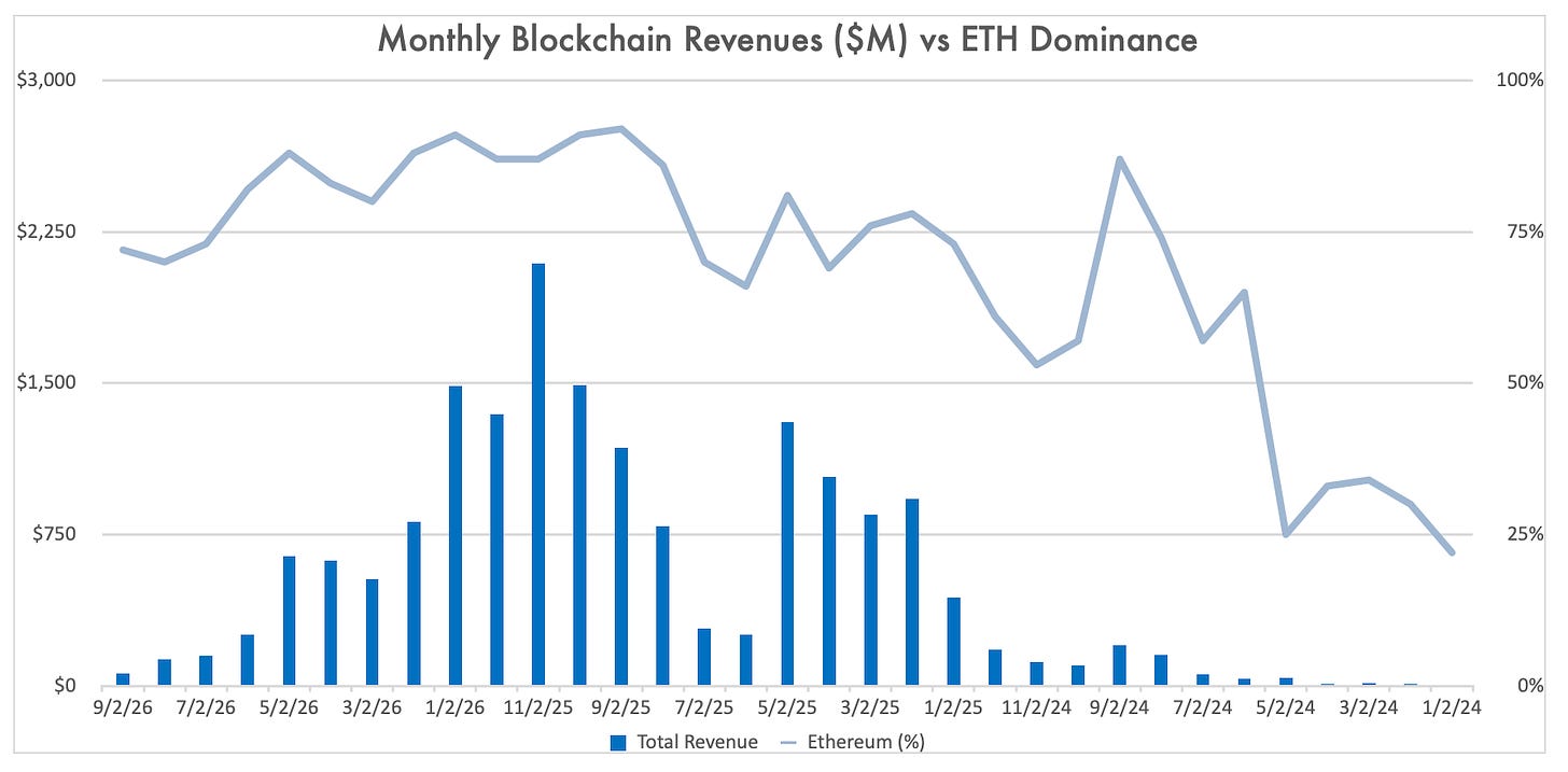 - That said, we are excited about Ethereum’s L2 scaling solutions as they relate to everyday users, while we also recognize the value in select competing blockchains As a result, we’ve been highly conservative in modeling a decline in Ethereum’s dominance, from over 80% today to 60% by decade’s end, even as we continue to believe Ethereum is likely to retain a materially larger portion of the market