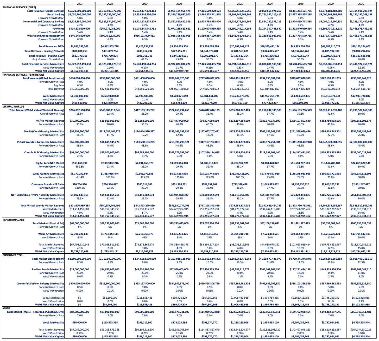With all of this in mind, we can now begin to build out a detailed model that accounts for Ethereum’s cash flows when factoring in the Total Addressable Market (TAM) across different verticals.