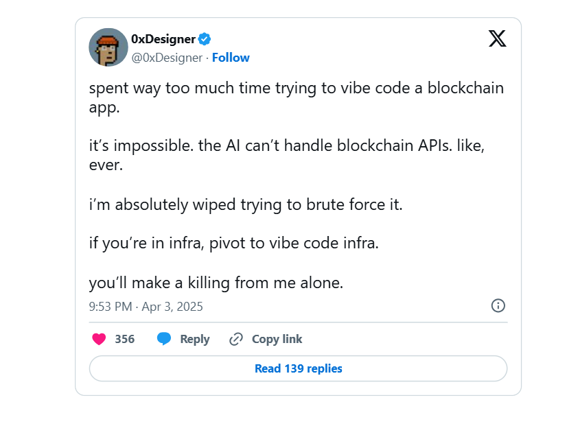 Of course, this all comes with caveats. Vibe coding in crypto isn’t risk-free, especially when smart contracts are involved. And for many builders, AI still struggles with blockchain-specific code. As 0xDesigner joked, “If you’re in infra, pivot to vibe-code infra — you’ll make a killing from me alone.”
