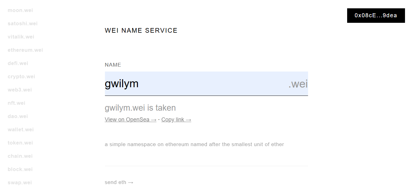 .weiname will be officially registered on Ethereum for one year. At this point, you can send and receive ETH using the name, manage it as you would an ENS domain NFT, or attach content to it, like a website.