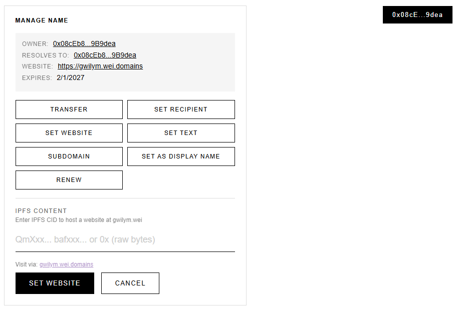 With the CID in hand, head back to wei.domains and go the "Manage Page" portal in your name dashboard. From there, click the "Set Website" button, paste in your CID, and confirm the update with your wallet. After this, your.weiname will begin resolving to the content stored on IPFS. For example, you can find my bio page at gwilym.wei.domains.