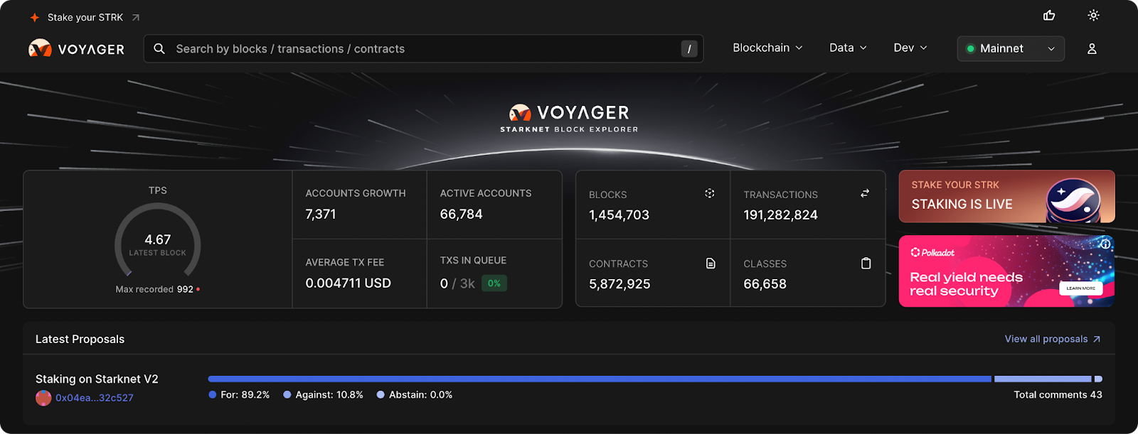 Starknet’s main block explorer, letting users look up addresses, contracts, and overall communications flowing between Ethereum and Starknet. It’s the main tool for seeing what’s happening on Starknet in real time.