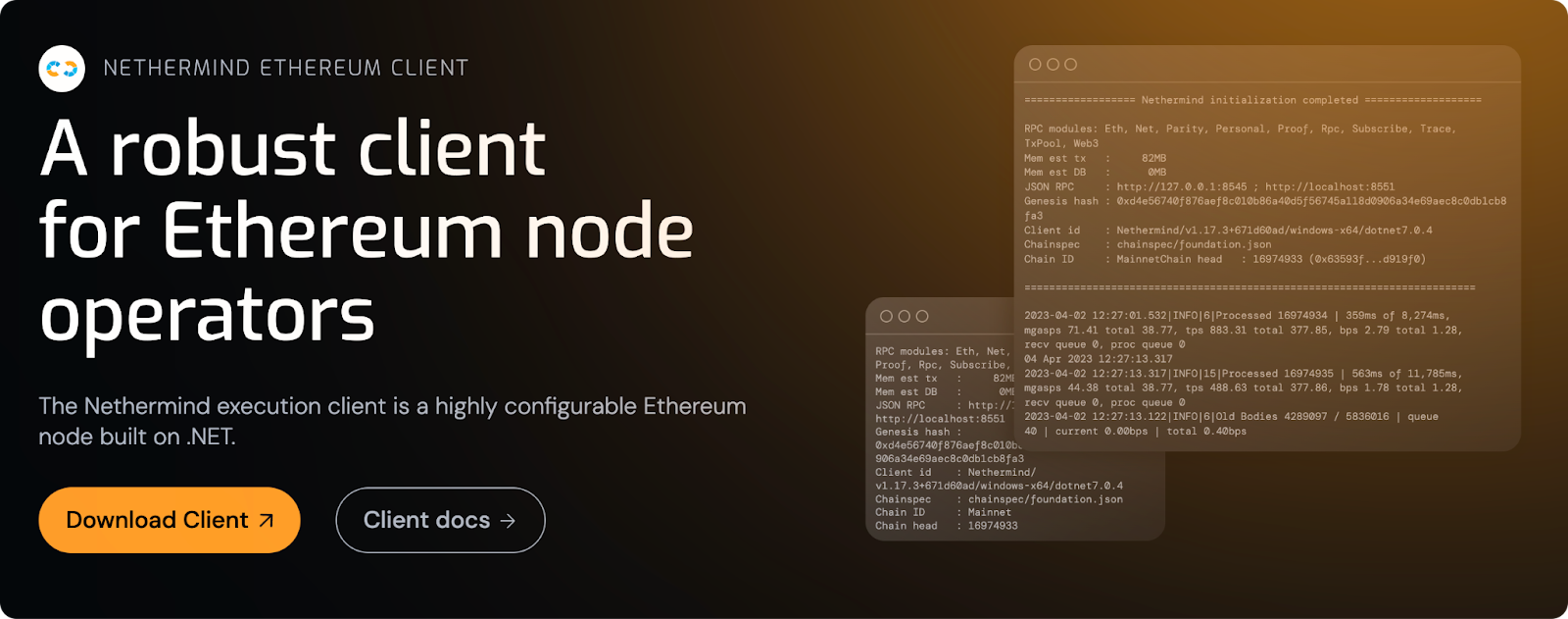 Their flagship product. It's one of several software implementations that validators use to run Ethereum nodes. Having multiple clients for the network isn't redundancy — it's insurance. If one client has a bug and drops, the others step in and keep the network running. Nethermind's version comes built on .NET Core which works across Windows, macOS, and Linux, making it accessible to more operators and supporting Ethereum’s decentralization in the process.