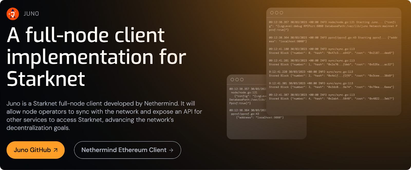 A full node client for Starknet that helps users and developers run their own Starknet nodes, syncing data and maintaining network state, while contributing to Starknet’s decentralization overall. Over time, Juno aims to become a full sequencer — meaning it will help order and process transactions.