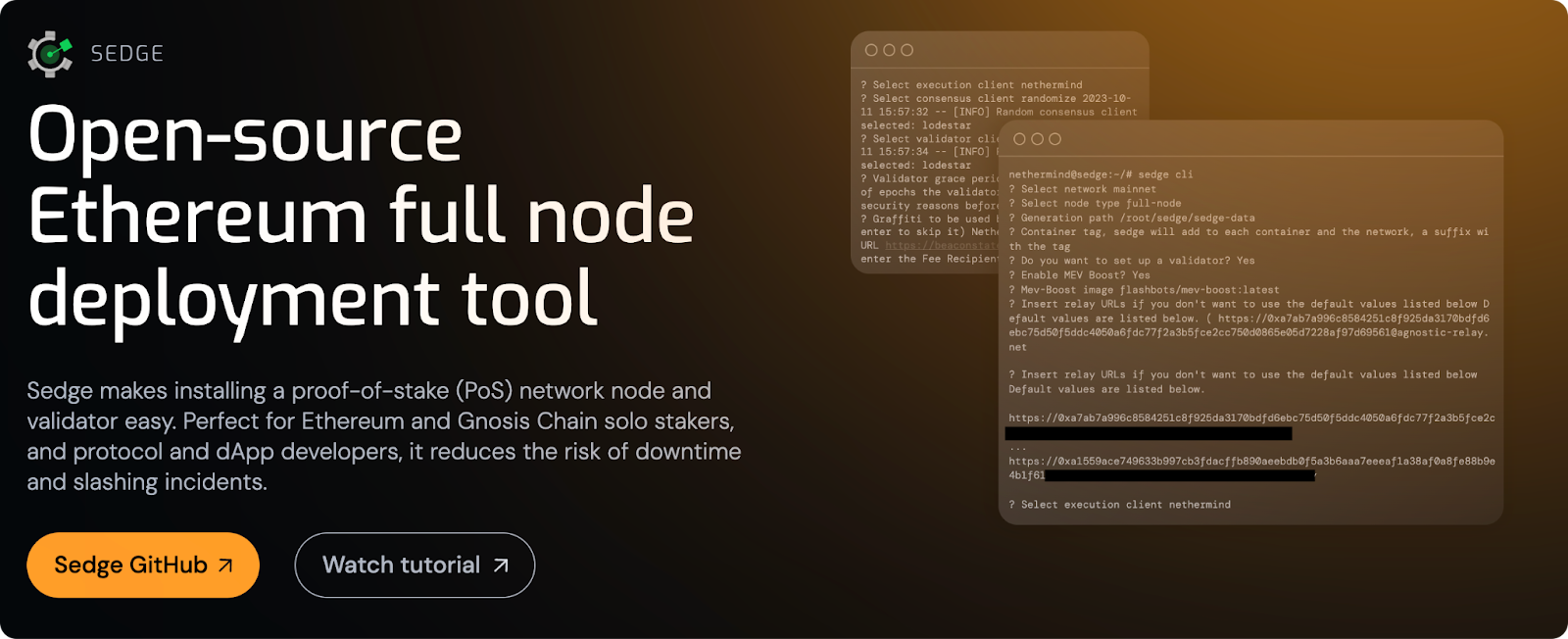 Running an Ethereum validator is notoriously complex — you need to configure multiple pieces of software, secure keys, and keep everything in sync. Sedge turns this into a one-click setup. It also comes integrated with Lido's Community Staking Module, letting anyone easily run a Lido validator as well by putting up ETH as collateral.