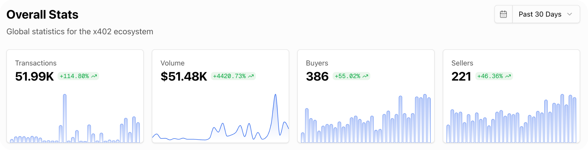 Usage of these AI-centric payment rails, which repurpose old HTTP code, has soared in recent weeks. Transactions are up over 100% in the past month, processing 51K+ transactions, with volume surging 4400% during that same period for a total of $51.5K. The numbers validate what many hoped: that crypto infrastructure — permissionless and programmatic — can solve real problems beyond speculation, and x402 is proving itself as a useful solution to the tangled web of API setups that currently plague the web.
