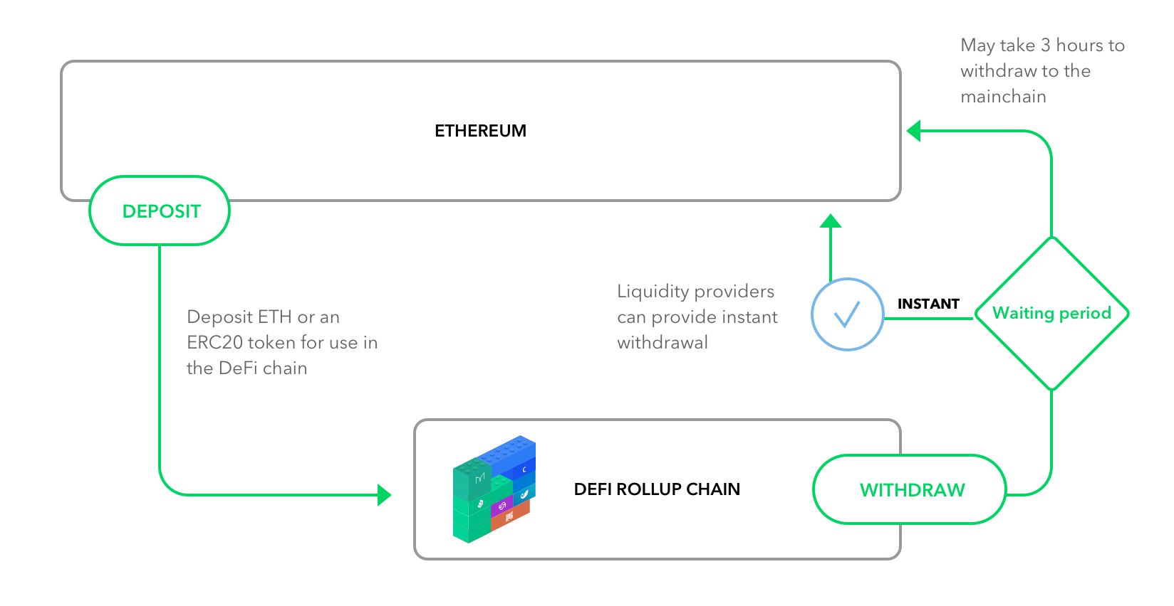 When a user wants to bring their assets back to layer 1, they issue a special withdrawal transaction. Here we see a potential difference: recall that Optimistic Rollup’s security model depends on the ability for parties to issue challenges; thus, we need to allow a grace period for any parties monitoring the activity to (potentially) prove fraudulence. This means that once a withdrawal is requested, the user must wait before the funds are accessible again on layer 1; the economic security this mechanism gives is a function of both the amount of stake required to produce rollup blocks and the length of this waiting period (Ed Felten argues here that 3 hours is sufficient).