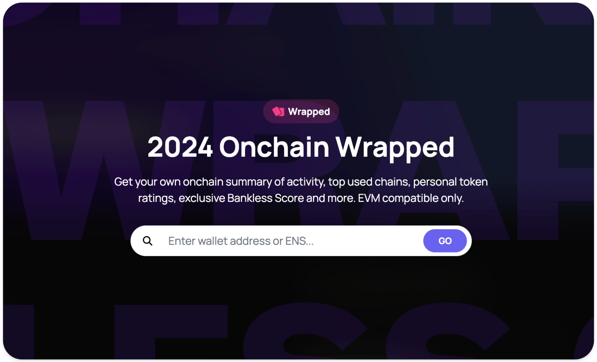 2024 was a year for the books, but how did you spend your year onchain? Bankless has built a tool to help you get your own free onchain summary of activity, top used chains, personal token ratings, an exclusive Bankless Score, and more!
