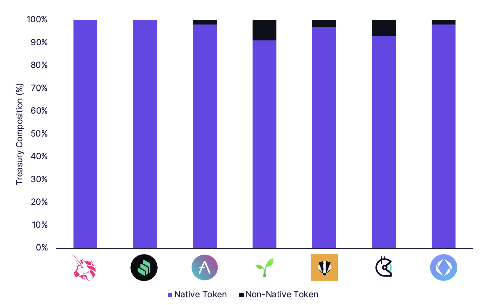 As this post outlines, native tokens should be thought of as the crypto-equivalent of authorized but unissued shares. If Uniswap tried to liquidate 1% of its liquid treasury from UNI to DAI on 1Inch today, the slippage would be over 95%.