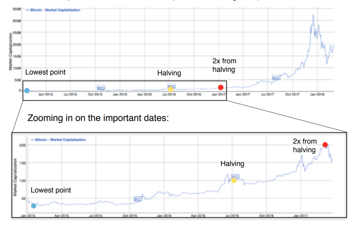 Below is a chart of Bitcoinâs market cap beginning in January 2015, and ending around March 2018. I included some points on the graph, which represent the following dates: