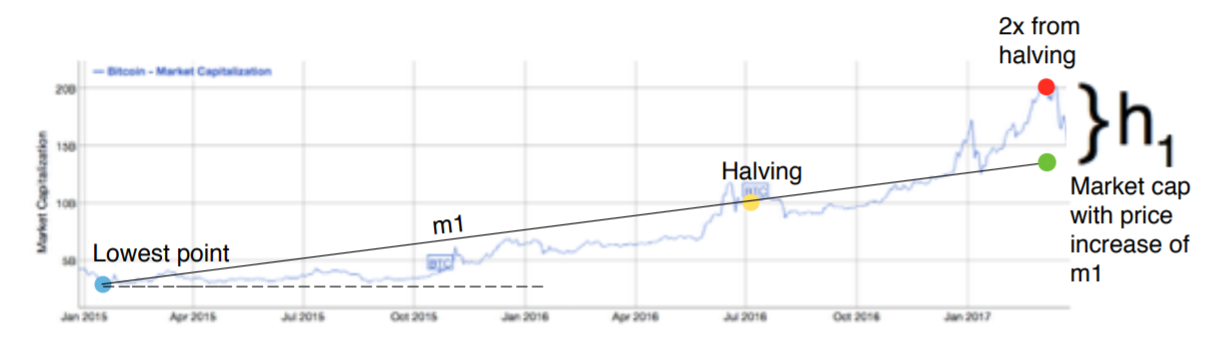 Letâs imagine that the halving had not occurred. In this case, we can assume that Bitcoinâs market cap would have continued to increase at the rate of m1, and would most likely be near the green point on the graph.