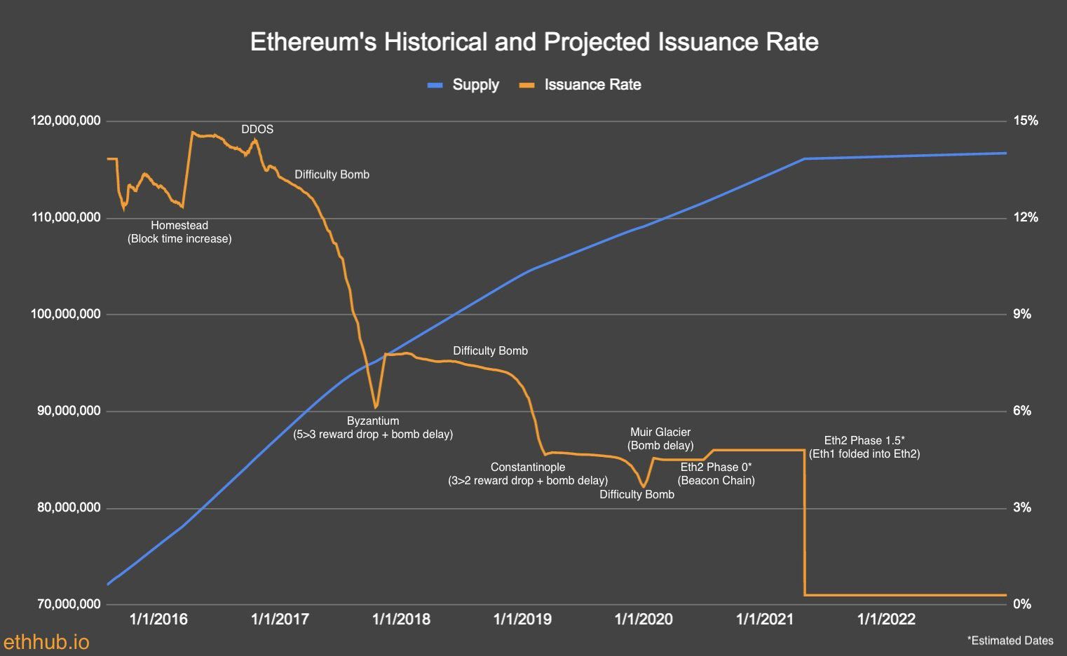 0.4% issuance in PoS Ethereum is the MAX issuance. Not included in this projection is the future burn-rate of ETH from EIP 1559. We won’t know how to project this burn rate until we are closer to ETH2, but it has been hypothesized that full utilization of all ETH 2.0s 64 shards would result in a negative-net issuance of Ether. I look forward to that yellow line dropping below 0.