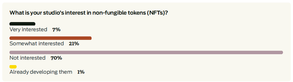 Fans think NFTs are just another way for gaming studios to make a quick buck. If true, developers are potentially leaving dollar bills on the sidewalk. A 2022 Game Developers Conference report surveying over 2,700 game developers finds that “a majority of game industry professionals said their companies were not interested at all in cryptocurrency (72%) or NFTs (70%)”.