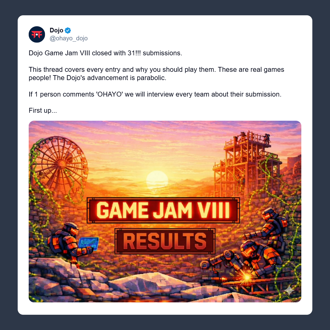 These Game Jam VIII experiments were built by small teams over a period of a few days, but they're already showing us what's coming in crypto gaming. Rapid iteration, build with any engine (Dojo, CairoVM, Godot, etc.) for any genre. New kinds of onchain gaming economies, new kinds of AI games, new kinds of zero-trust multiplayer titles.