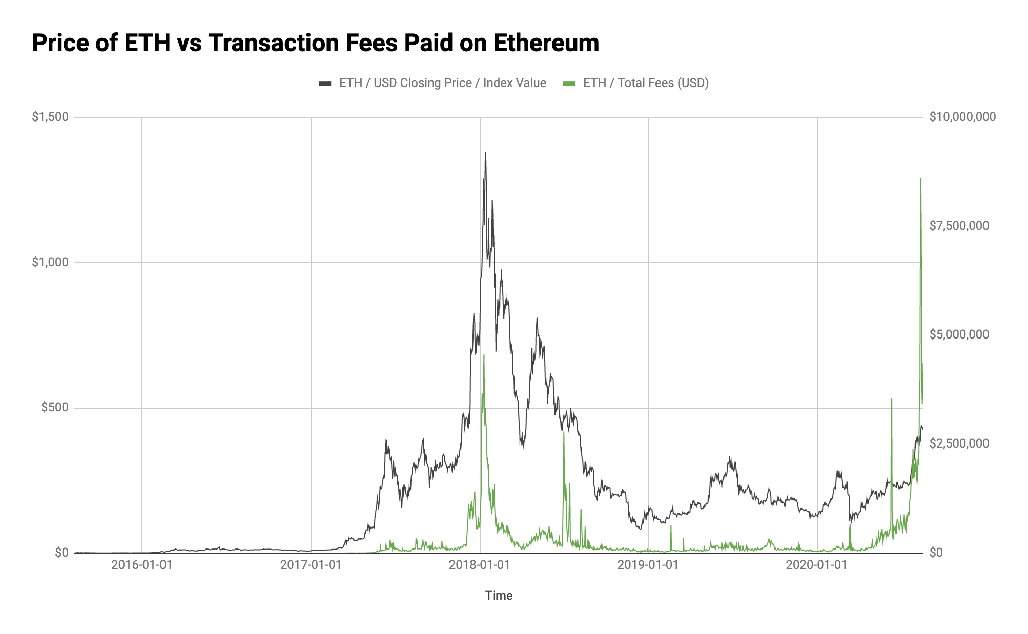 Above — Ethereum price vs. transaction fees paid on the network. Data via CoinMetrics