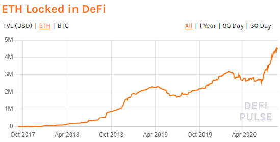 This demand for ETH from DeFi is apparent in the data too. There’s now over 4.5 million ETH locked up in Ethereum financial protocols—valued at nearly $2B. This means that roughly 1 in every 25 ETH in circulation is locked up in DeFi right now.