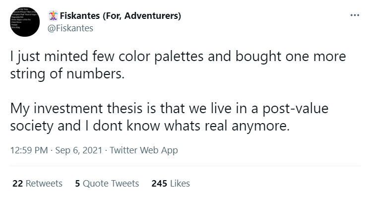 And the award for the most Baudrillardian Crypto Twitter comment ever goes to … Fiskantes! For example, consider how old viral memes are being resurrected by their creators as NFTs lately. The sign value (i.e. the social power, the memetic energy, the “this is one of the greatest memes of all-time!” status) of these NFTs are paramount, followed by their exchange value and then their utility value.