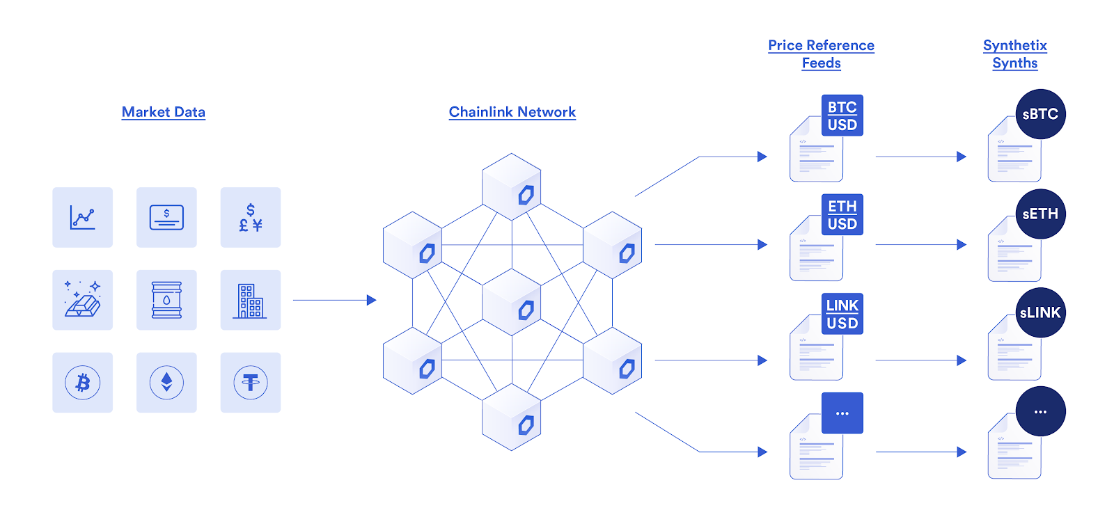 Another powerful financial primitive made possible through Chainlink DONs are protocols such as Synthetix, which enable users to generate synthetic assets that are overcollateralized by on-chain crypto (SNX) and mirror the price of real world assets such as cryptocurrencies (e.g. BTC, ETH, LINK), fiat currencies (e.g. USD, EUR, JPY), commodities (e.g. gold, silver, oil), indices (e.g. FTSE, N225, sDEFI), and equities (e.g. TSLA, GOOG, AMZN). Backed by a global debt pool, users can “exchange” their synthetic assets at zero slippage for any other synthetic by simply switching the data feed that determines the value of their tokens.