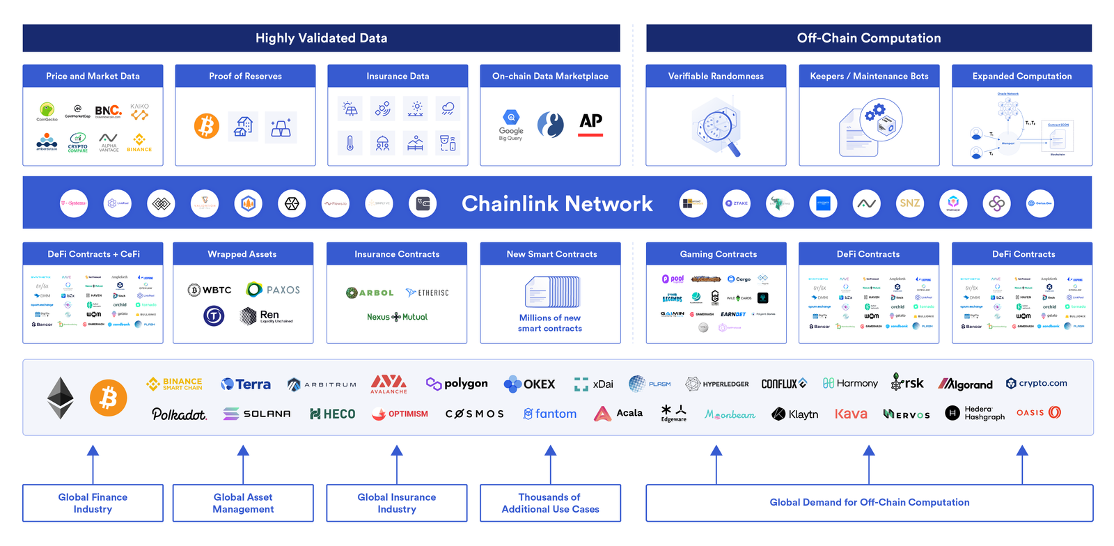 Currently, there are over 450+ Chainlink Price Feeds operating across a number of blockchain networks including Ethereum, Polygon, BSC, Avalanche, xDai, and Heco, with plans to expand access to many more blockchains and layer 2 solutions such as Arbitrum, Optimism, Solana, and beyond. The oracle network provides not only decentralized Data Feeds, but also a wide range of secure off-chain computation services including Verifiable Randomness, Keepers, and other various forms of off-chain computation in development like FSS, DECO, and Town Crier.