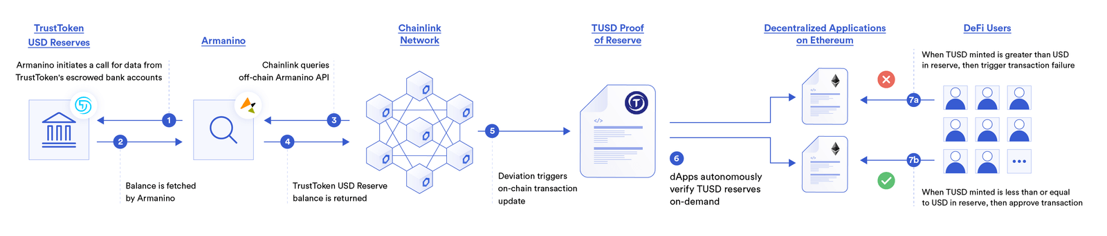 In the case of stablecoins, which are often collateralized by US dollars held in a bank account off-chain, we see Proof of Reserve feeds for both Paxo’s PAX stablecoin as well as TrustToken’s TUSD stablecoin. With the latter, reserve data is provided by Armanino, a top-25 US auditing firm who provides real-time updates that attest to the off-chain USD bank holdings of TrustToken that back the TUSD stablecoin. Given TUSD exists across multiple blockchains, they have launched both Proof of Reserve and Proof of Supply data feeds on Ethereum, which can be cross-referenced by a smart contract application before allowing users to engage in economic activity with the stablecoin.