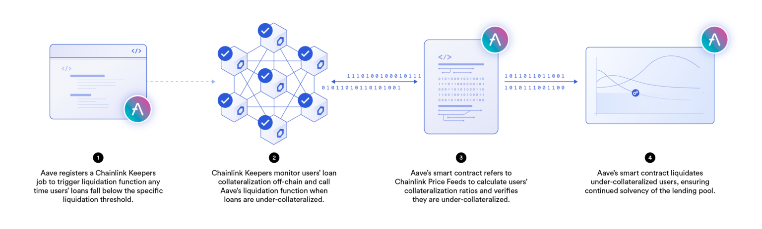 An example use case of Keepers is automatically liquidating undercollateralized loans for decentralized money markets such as Aave. Here, Keepers would monitor positions on the platform and trigger the liquidation function on any loans that fall below the specific pool’s liquidation threshold. Aave’s smart contract would then verify the liquidation on-chain by cross-referencing Chainlink Price Feeds and then begin the liquidation process. As a result, the money market would provide users increased guarantees regarding the solvency of the platform through highly reliable liquidation bots.