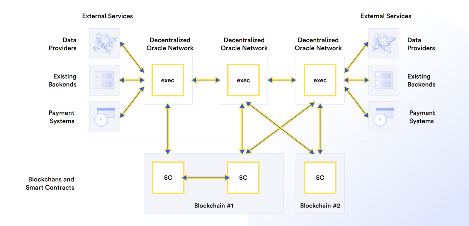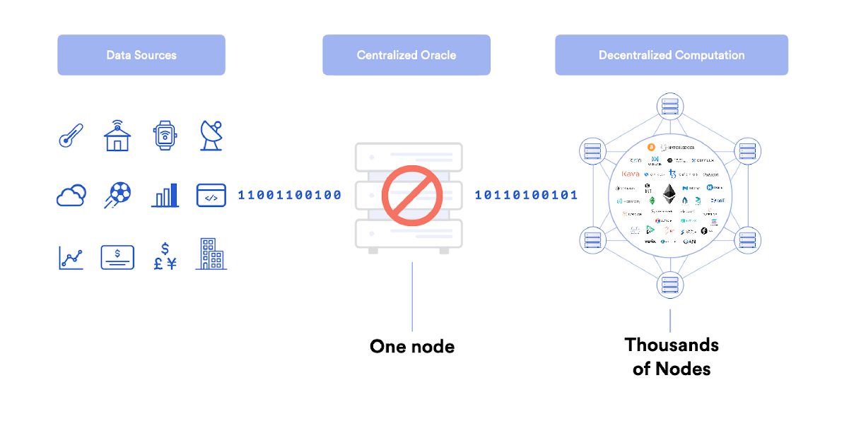 Instead, the oracle mechanism must be decentralized at the node operator and data source level in order to ensure there is no point of failure. While blockchains and oracles aim to achieve different goals (the former providing consensus on transactions and the latter consensus on real world data), their complementary nature means similar approaches are taken to achieve security.
