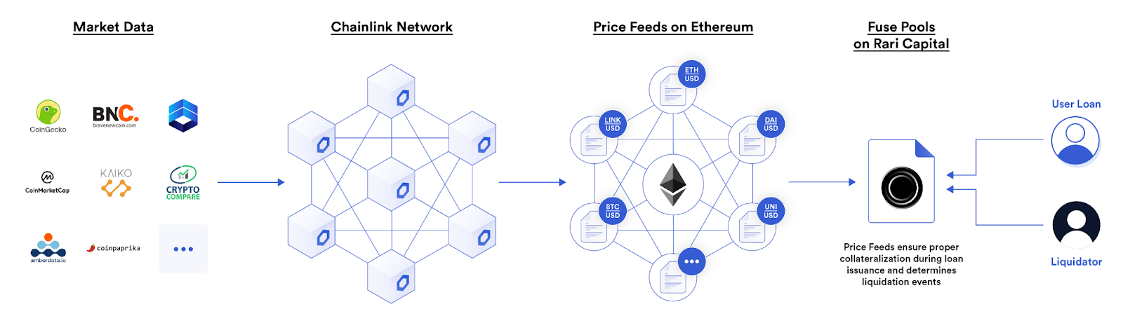 This creates a two-sided marketplace where lenders can earn passive yield on their idle tokens and borrowers gain access to working capital to deploy as they please. Decentralized money market protocols like Aave, Compound, Cream, Rari, and more use Chainlink Price Feeds to calculate the maximum loan size during the creation of a position as well as determine when positions become under-collateralized and must be liquidated, keeping the market as a whole solvent.