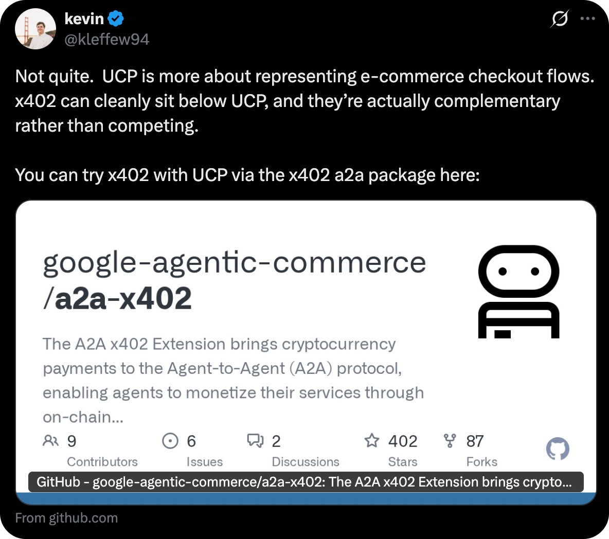 Initially, some wondered whether this pits Google against x402. It doesn't. They're different kinds of protocols.