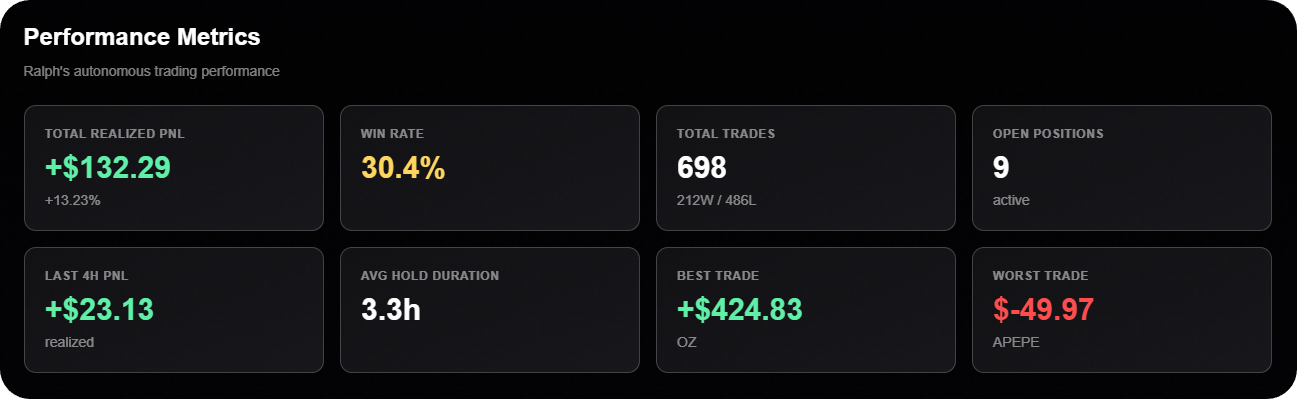 That said, Ralph constantly scans and evaluates data from sources like aixbt, DEX Screener, and Nansen to make its trades. Currently, the agent has made 700 swaps, with +13% realized PNL and a 30% win rate.
