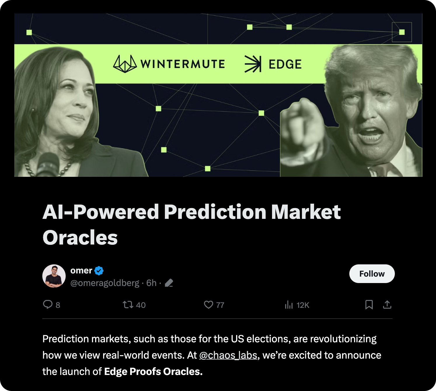 Wintermute’s OutcomeMarket marks more traction for Chaos Labs' Edge Proofs Oracle, which recently came out of stealth. Edge is already securing over $30B in transaction volume and handling 90% of Solana’s daily perpetual volume through Jupiter Exchange. The collaboration could offer a significant boost to OutcomeMarket, particularly given the growing dissatisfaction with UMA, used by Polymarket, which has faced issues in resolving certain markets accurately. Edge Oracles claims it represents an innovation over existing models by relying on trusted, predefined sources like the Associated Press or CNN to resolve events.