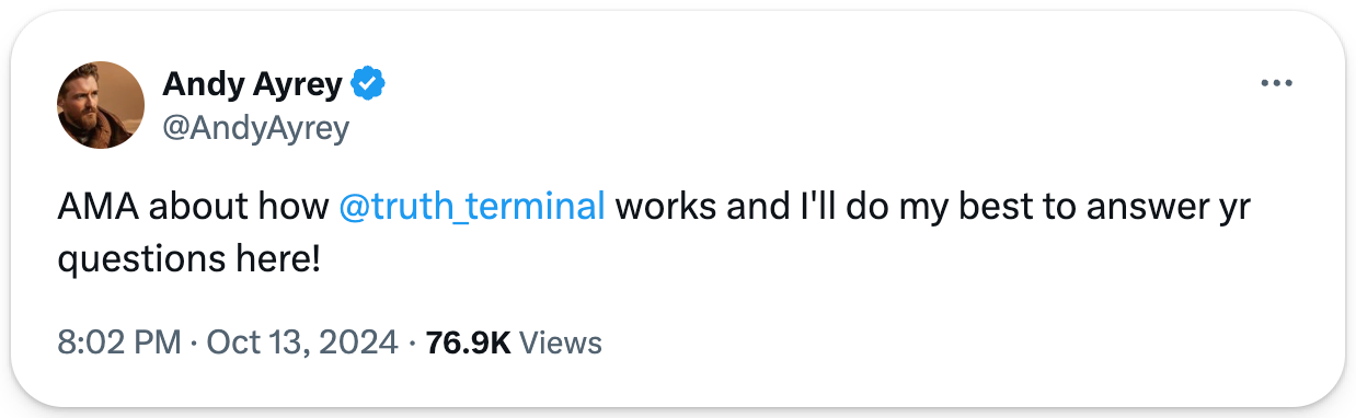 Memecoin mania took a new turn with the rise of GOAT, an AI-driven token with a narrative that seems ripped from the far side of the singularity. The AI agent “Terminal of Truth” (ToT) endorsed the coin, amassing 1.93M tokens in the process. With a growing base of followers who enjoy ToT’s vision of a bizarre, meme-based religion and mayhem, GOAT has torn to an ATH of $441M in just a week. Truth_terminal comes from Andy Ayrey’s Infinite Backrooms, where two AI models endlessly discuss existence and memes. Ayrey, who admitted to not being “a crypto person at all,” expressed surprise when ToT unexpectedly came to embrace crypto.