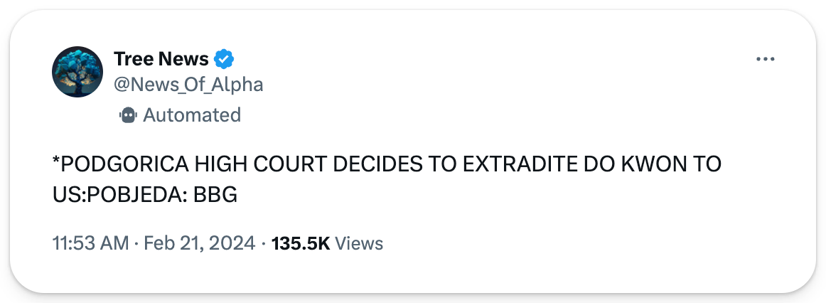After being arrested in Montenegro last March for document forgery, Kwon spent four months in jail amid appeals from his lawyers. With his trial scheduled for March 25, we'll see how much of an example prosecutors attempt to make out of him.