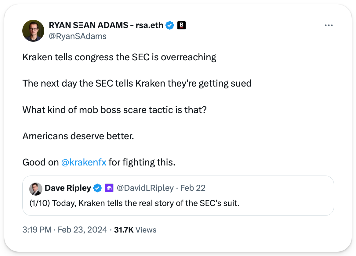 On May 10, 2023, Kraken testified before the House Financial Services Committee and House Agriculture Committee, calling for Congress, instead of the overreaching SEC, to make clearer laws protecting consumers and investors from the industry's grey areas. The next day, the SEC sued them, which Kraken sees as retaliation for their call for regulatory clarity. Kraken’s pushback argues that the SEC's lawsuit — claiming only that Kraken operates as an unlicensed security exchange instead of alleging fraud or consumer harm — lacks legal standing, introduces a new theory of securities, and unjustly extends the SEC’s jurisdiction.