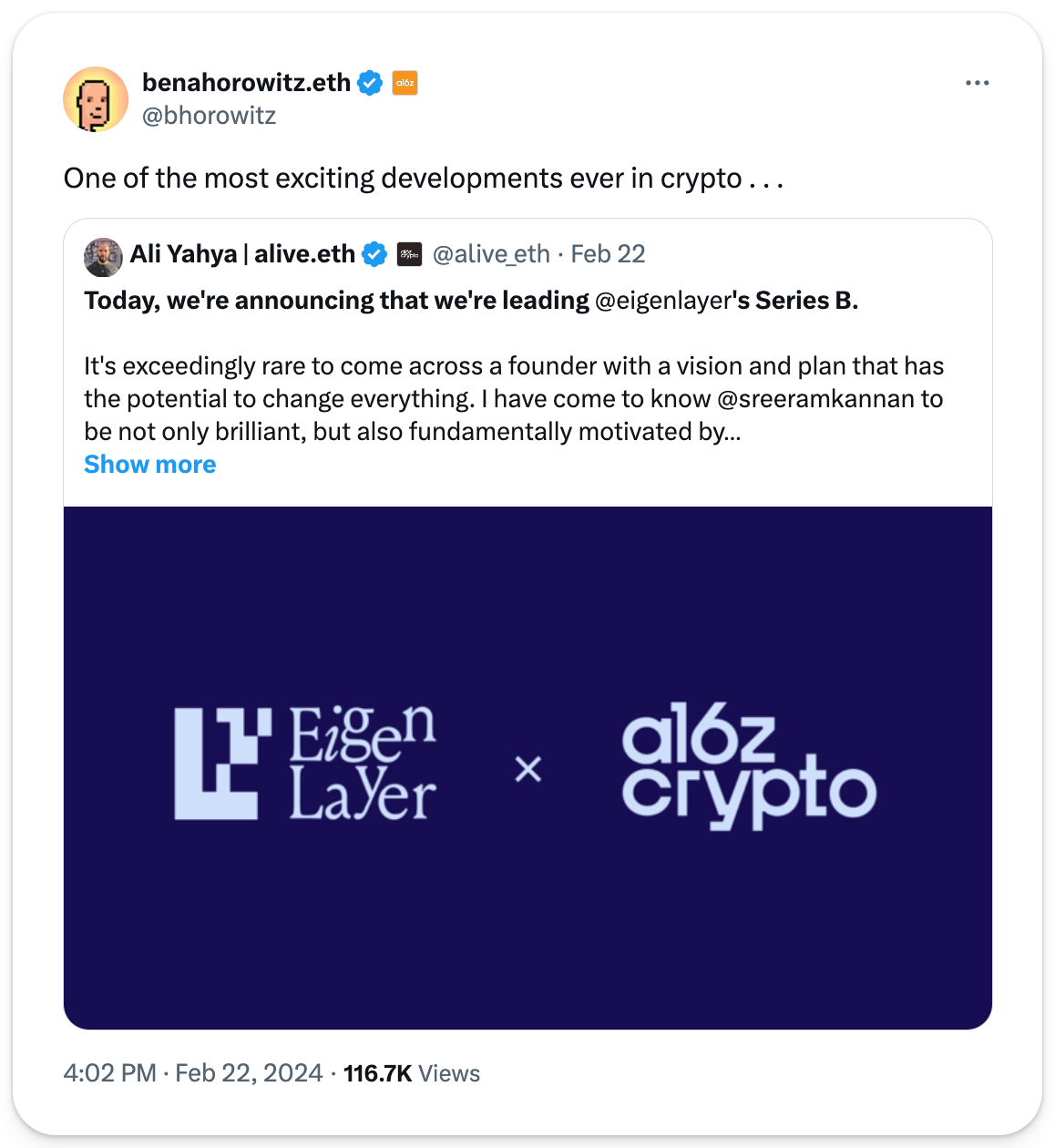 Everyone wants in on EigenLayer, especially Andreessen Horowitz, who announced this week they had invested $100M in Eigen Labs.