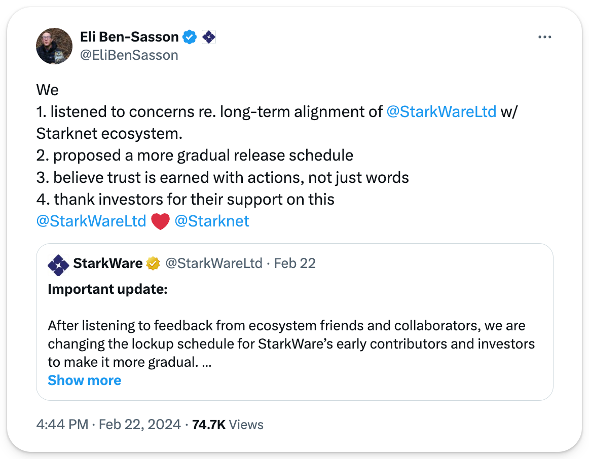 On Thursday, Starkware announced an amendment to the token unlocking schedule that greatly slows the release of the 13.4% tranche of tokens originally intended to be unlocked in April. The rest will now be gradually released monthly til March 2027.